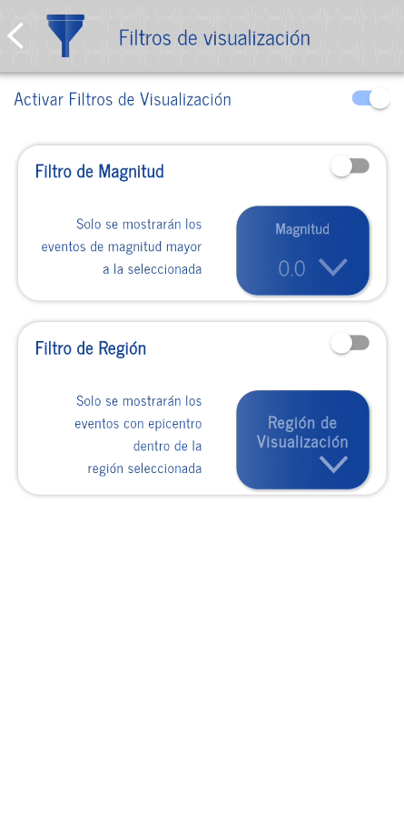 - Filtros para mostrar únicamente los terremotos de unos parámetros particulares (de magnitud mínima y región).