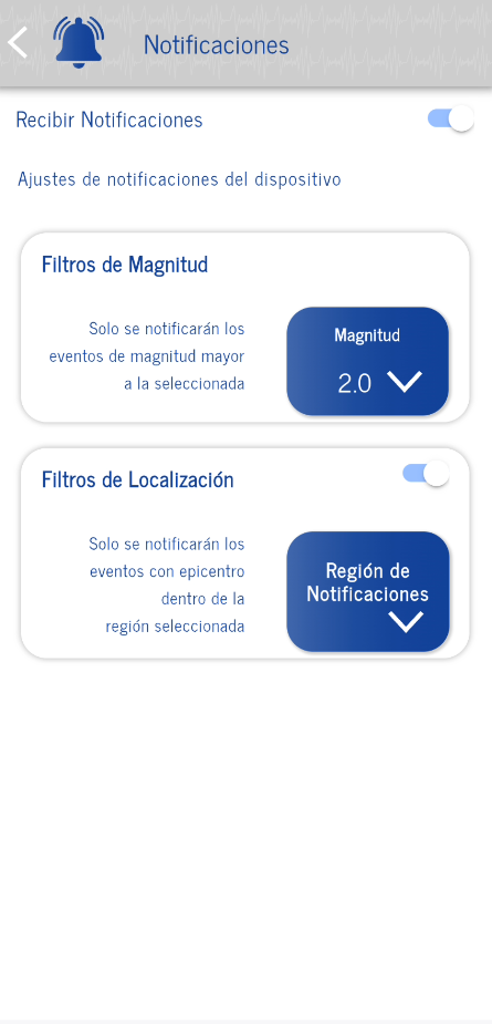 - Posibilidad de activar el servicio de envío de notificaciones en caso de evento sísmico.