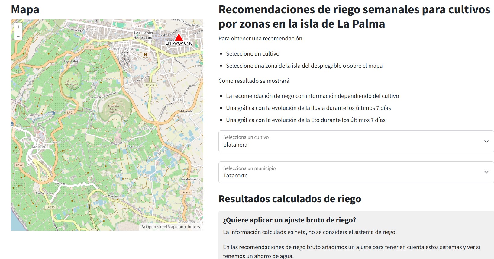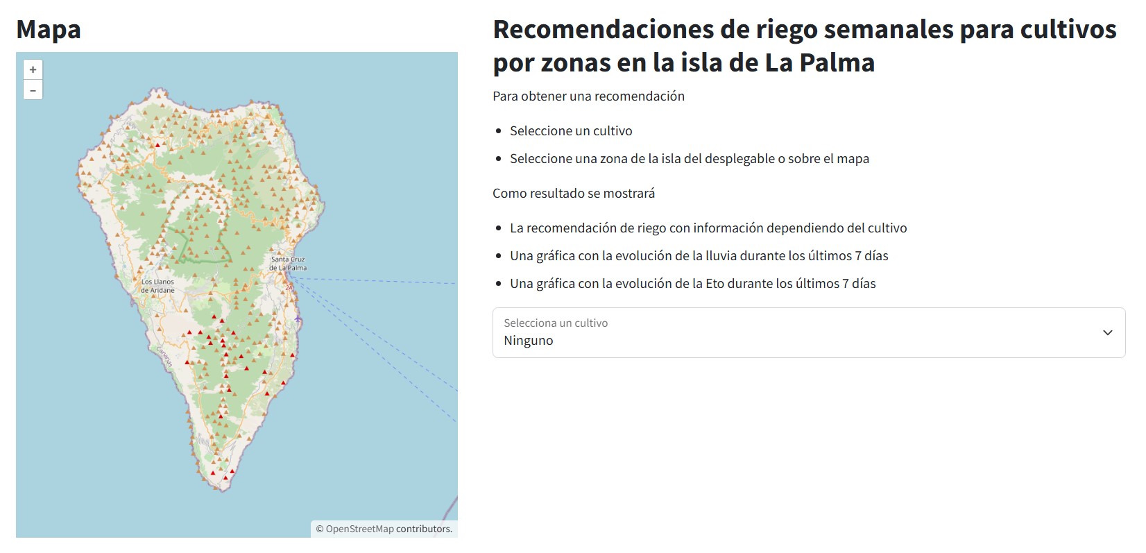 Para obtener una recomendación personalizada, el usuario debe seleccionar un cultivo y una zona de la isla a través de un desplegable o sobre el mapa. En vez hecho esto, la aplicación: