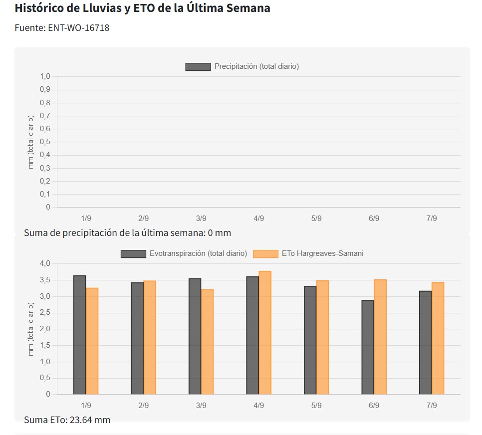 - Proporciona gráficos detallados que muestran la evolución reciente de la precipitación y la evapotranspiración (ETo) en los últimos 7 días en la zona seleccionada.
