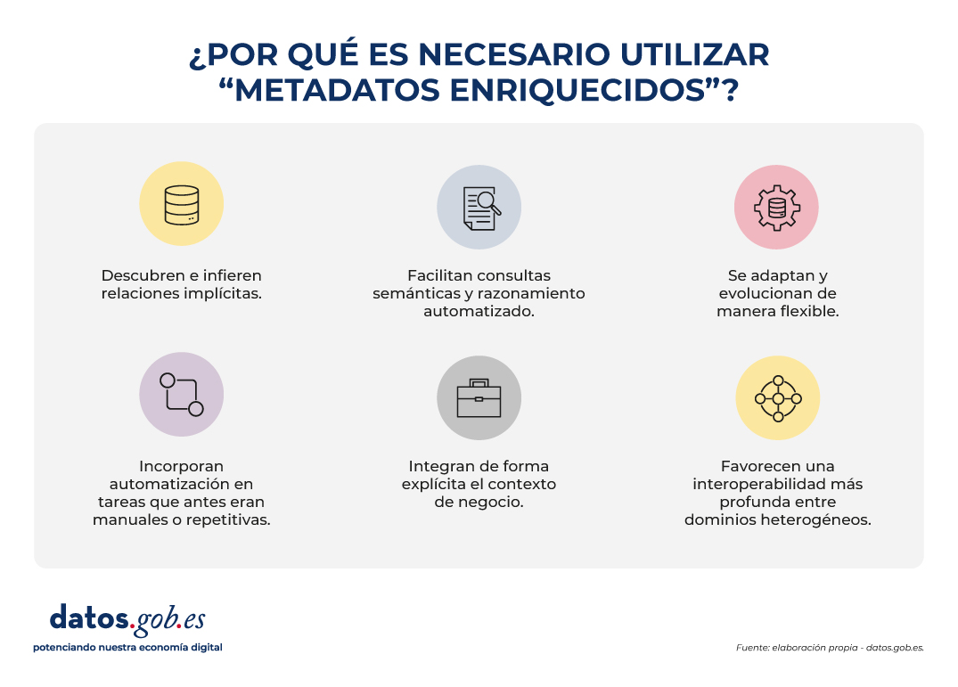 Los metadatos enriquecidos permiten aprender de los datos, mejorar la interoperabilidad semántica entre dominios y facilitar consultas más expresivas, donde las relaciones y dependencias pueden descubrirse de forma automatizada. De este modo, favorecen la integración de información dispersa y apoyan tanto la toma de decisiones informadas como el desarrollo de modelos de inteligencia artificial más explicativos y confiables.