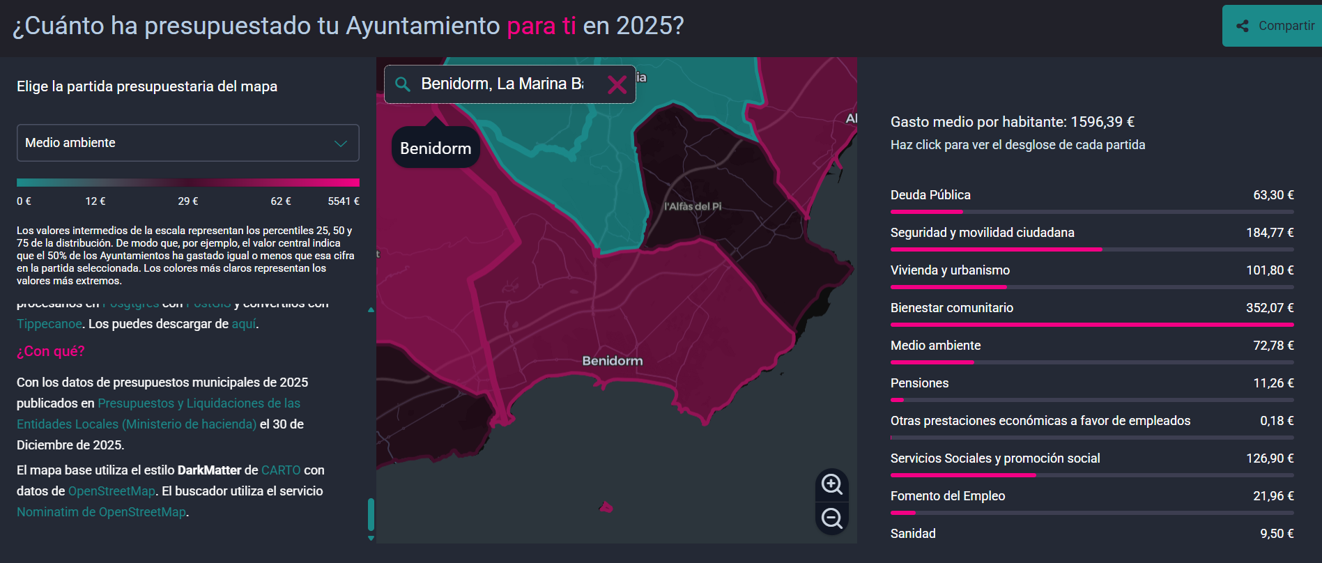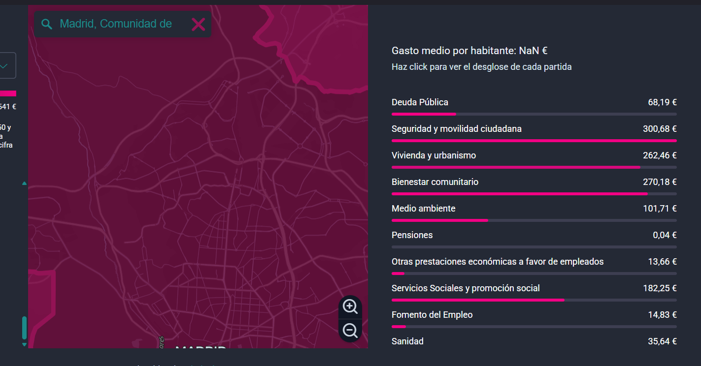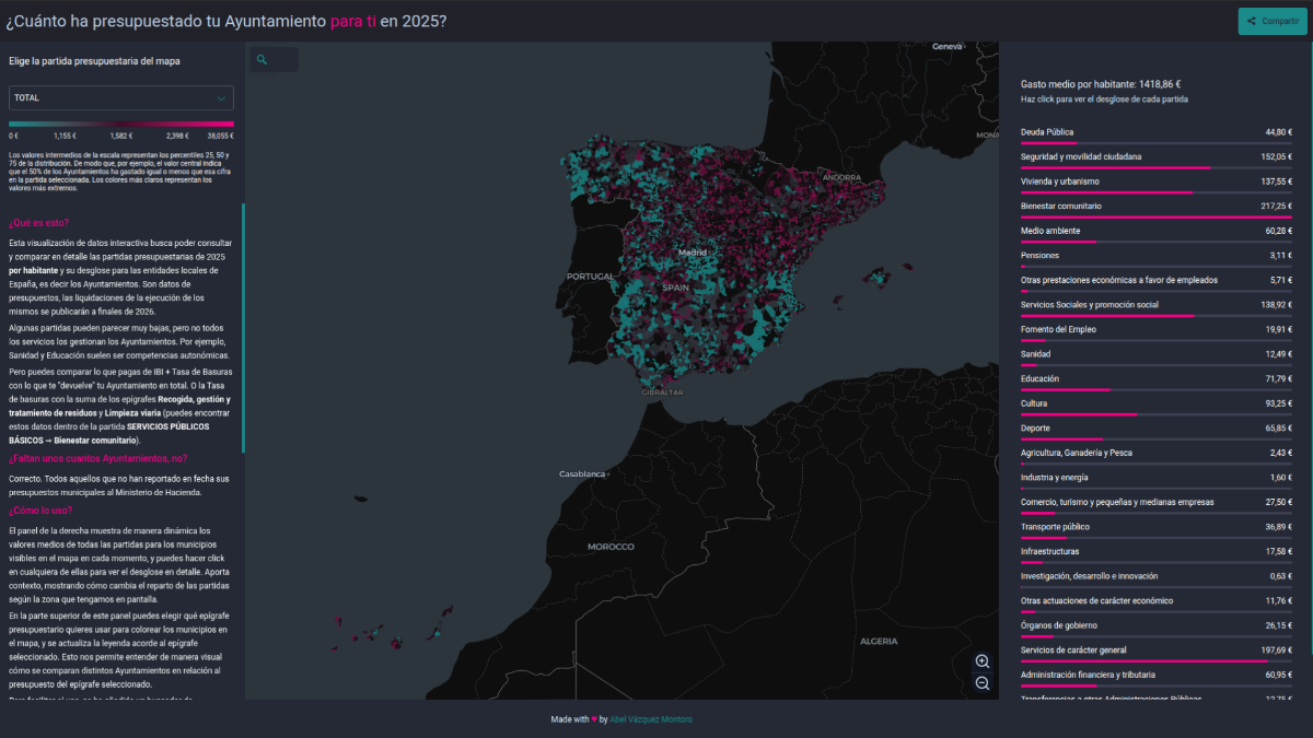 This interactive data visualisation allows users to consult and compare in detail the 2025 budget items per inhabitant and their breakdown for local authorities in Spain, i.e. town councils.