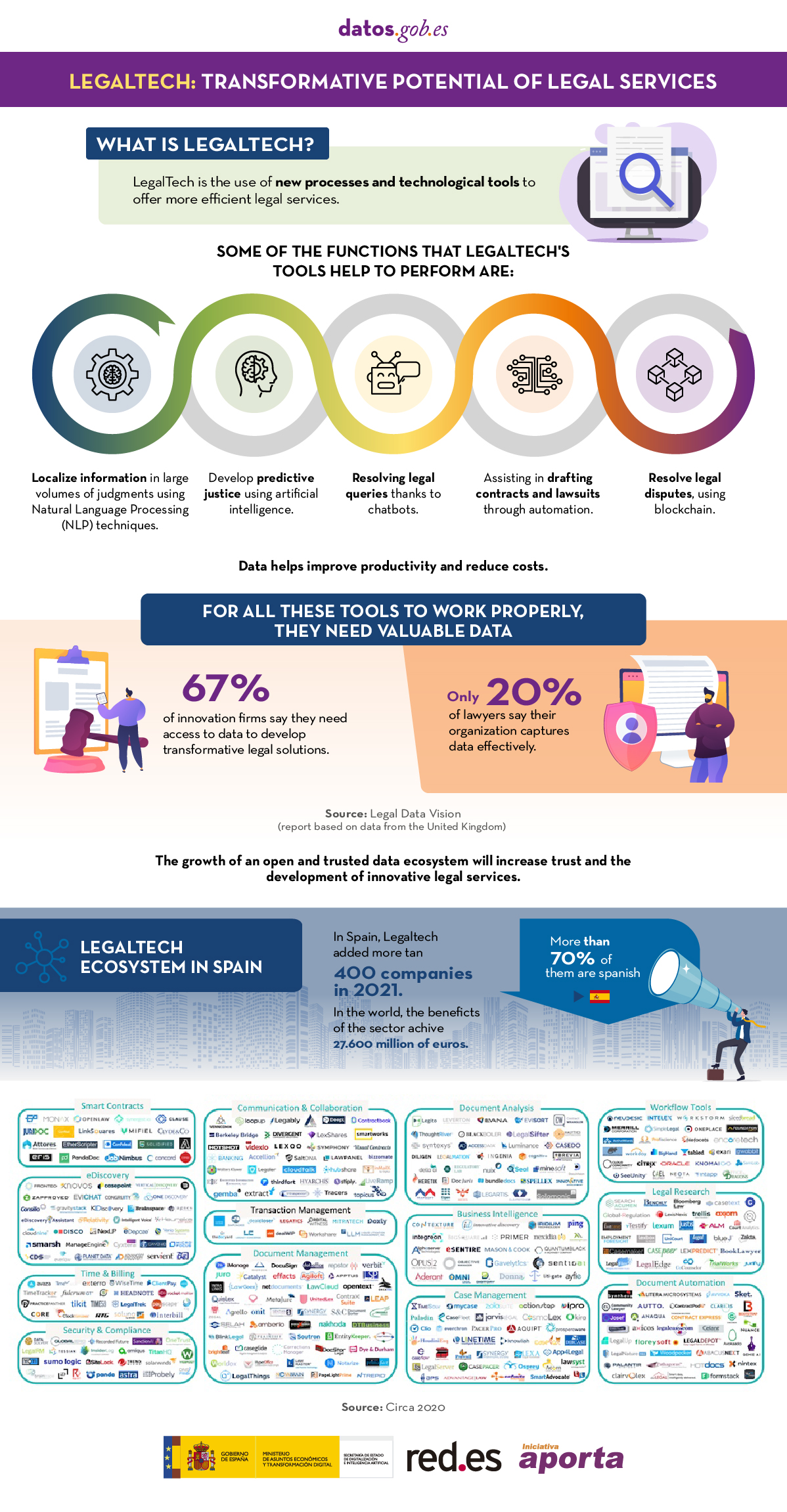 According to Gartner, legal areas are set to increase spending on technology solutions by 200% by 2025. In countries such as France, a large number of start-ups focused on this area are already emerging, many of which reuse open data. In Spain we are also experiencing an expansion of the sector, which will enable improvements to be implemented in the processes and services of legal companies. In 2021 there were more than 400 companies operating in this field and, globally, according to figures from Stadista, the sector generated more than €27 billion.