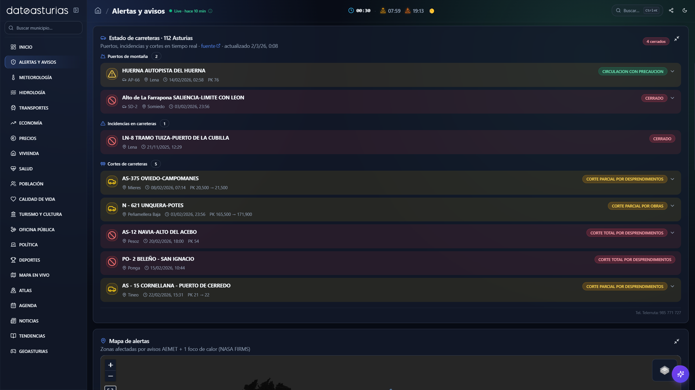 La aplicación integra un amplio conjunto de funcionalidades organizadas por ámbitos temáticos. En el bloque de alertas y avisos, incluye avisos meteorológicos activos (AEMET), focos de calor detectados por satélite (NASA FIRMS), terremotos (IGN) y el estado de carreteras y puertos de montaña (112 Asturias).