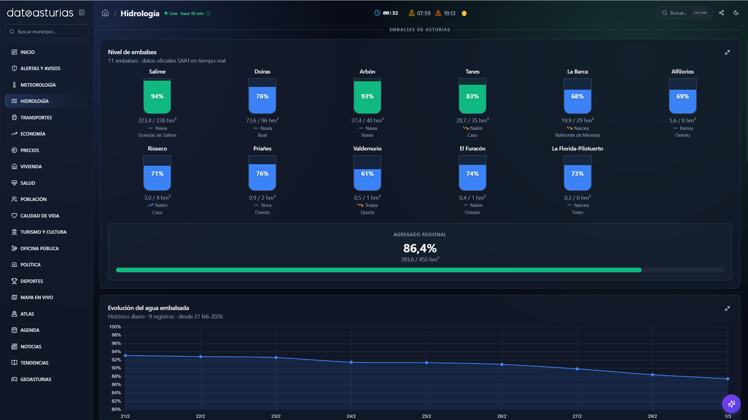 - El apartado de hidrología recoge caudal de ríos, nivel de embalses, pluviómetros y datos en tiempo real del SAIH Cantábrico, junto con histórico semanal acumulado y capas WMS de riesgo de inundación (GloFAS/EFAS).