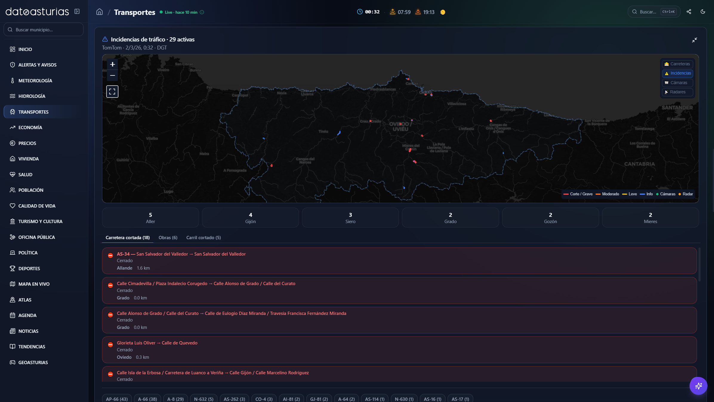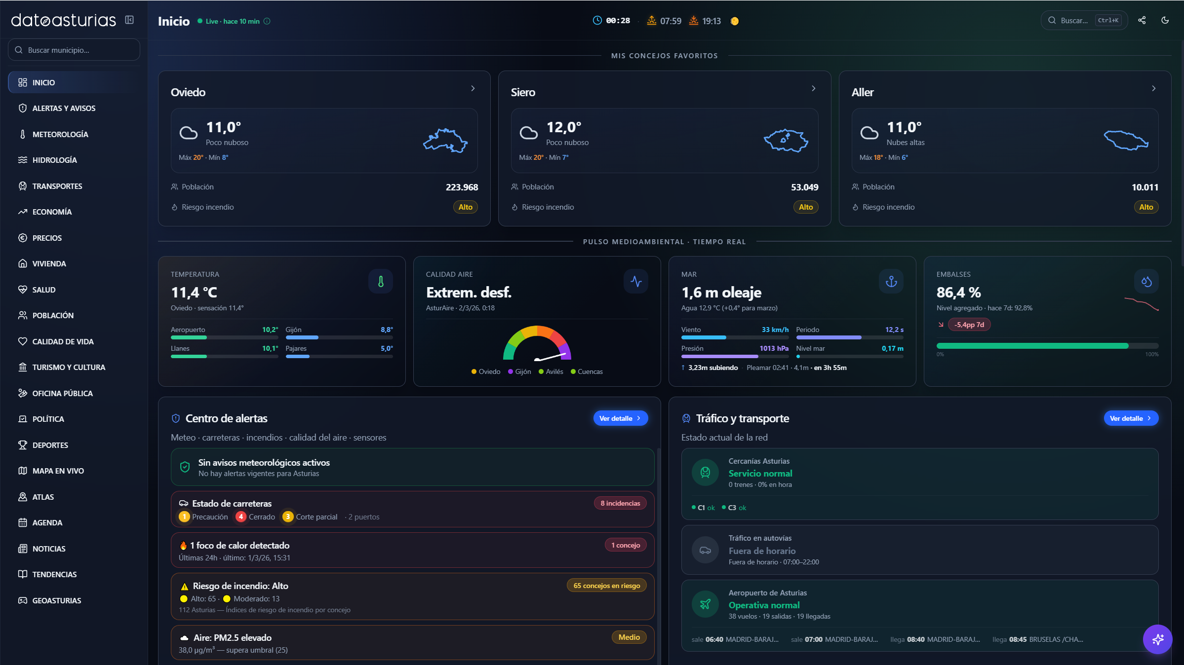 - En transportes, se muestran horarios y retrasos en tiempo real de Cercanías Asturias (Renfe GTFS-RT), vuelos del aeropuerto de Asturias (AENA), cámaras e incidencias de tráfico (DGT, TomTom) y tiempos de recorrido entre ciudades.