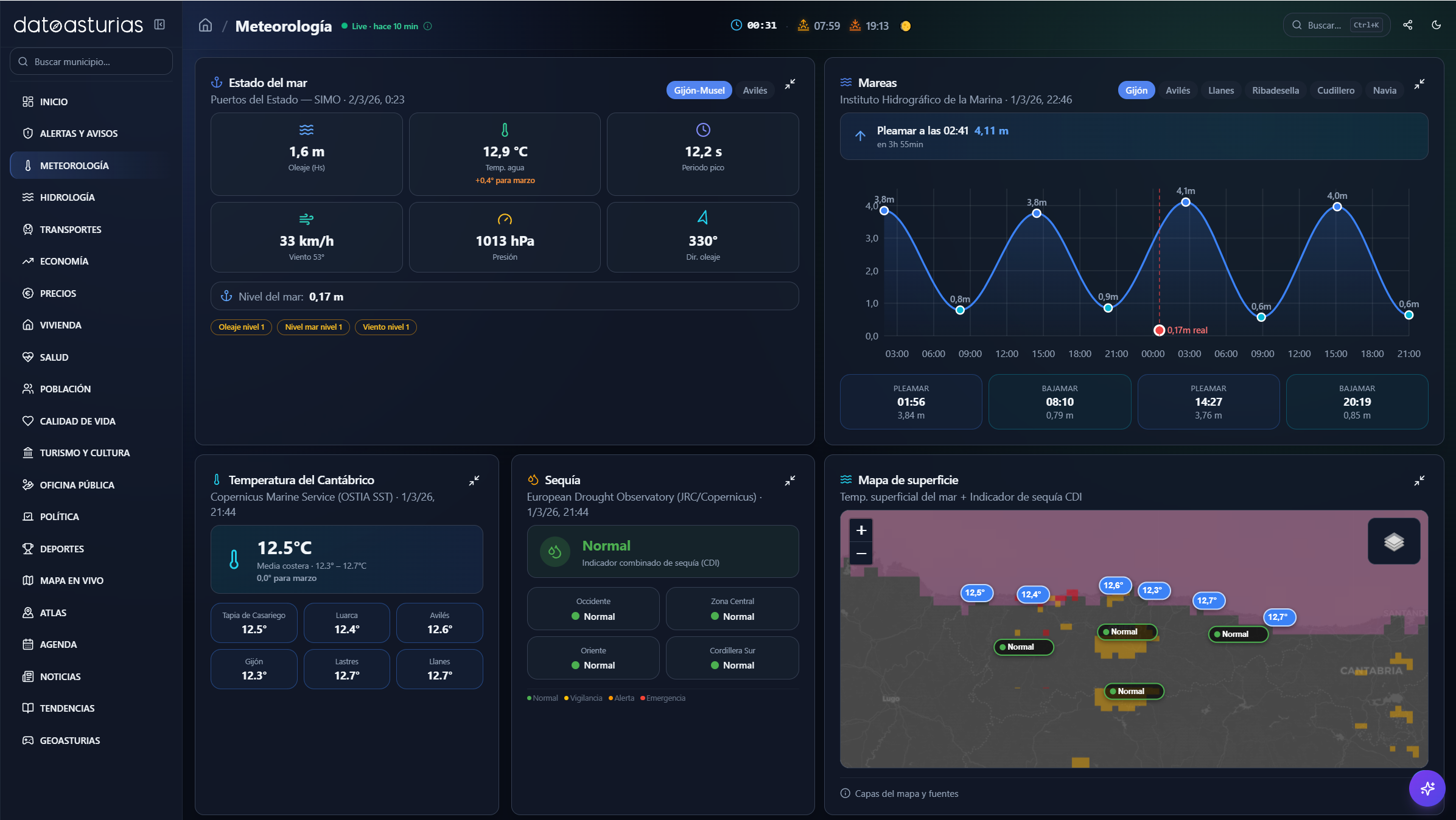 - En meteorología, ofrece predicción y observaciones para los 78 concejos, calidad del aire en tiempo real (AsturAire), pronóstico de polen y contaminantes (Copernicus CAMS), índice UV, calima sahariana, estado del mar y mareas (Puertos del Estado), temperatura superficial del mar (Copernicus Marine), información de estaciones de esquí, imágenes satelitales Sentinel-2 y monitor de sequía (Copernicus Emergency).