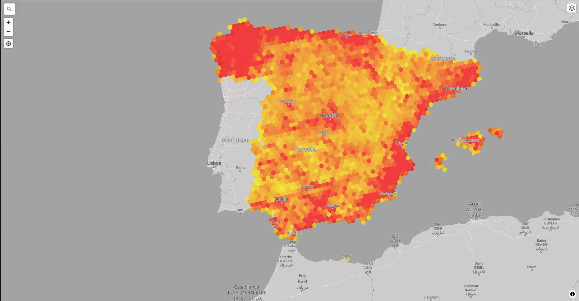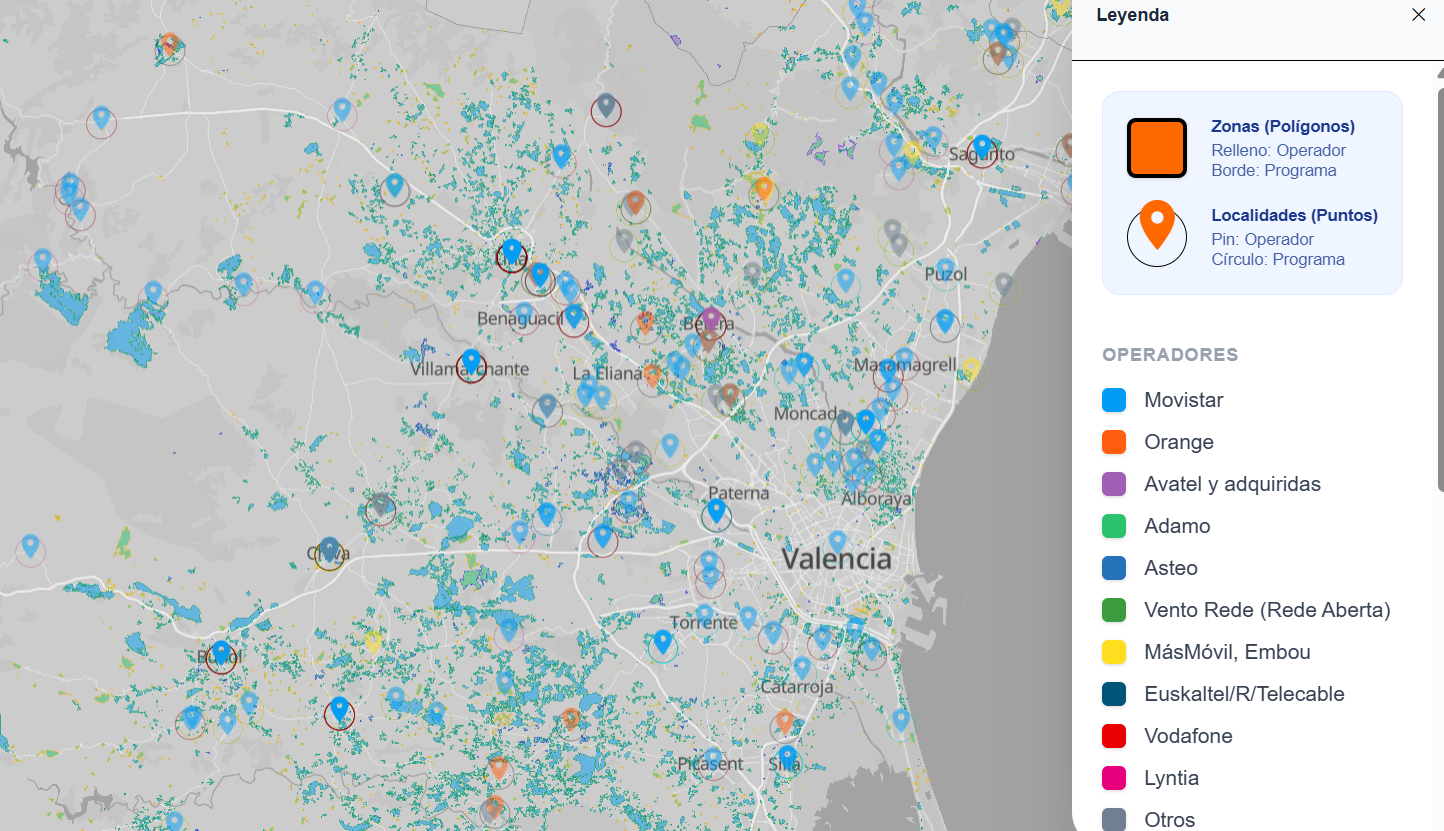 Visor web que muestra en un único mapa los despliegues de fibra de todos los programas PEBA y UNICO, a partir de los datos disponibles en abierto. Cada área tiene el color de fondo del operador adjudicado, y el borde es de un color diferente para cada programa. Para el caso del plan PEBA 2013-2019, como los despliegues se asignan a entidades singulares de población, se muestra un marcador con la ubicación obtenida del CNIG. Además, cuando no se hace zoom sobre el mapa, se muestra un mapa de calor en el que se puede ver la distribución por zonas de los despliegues.