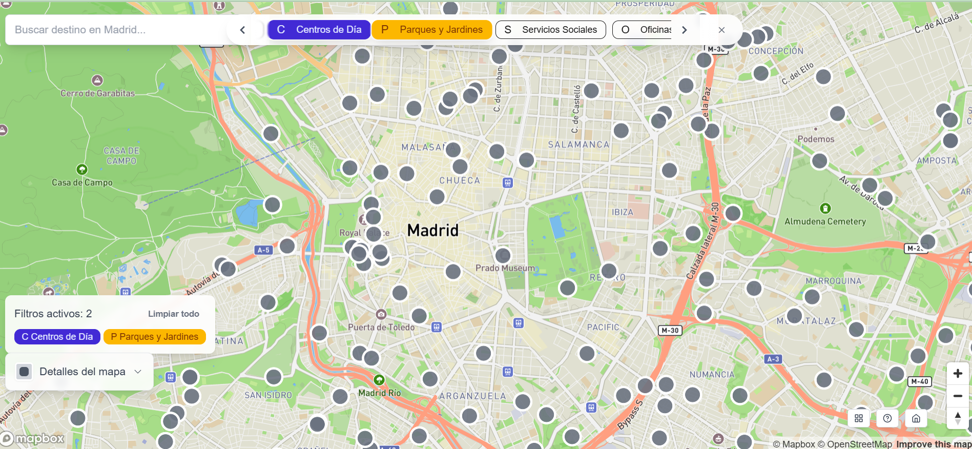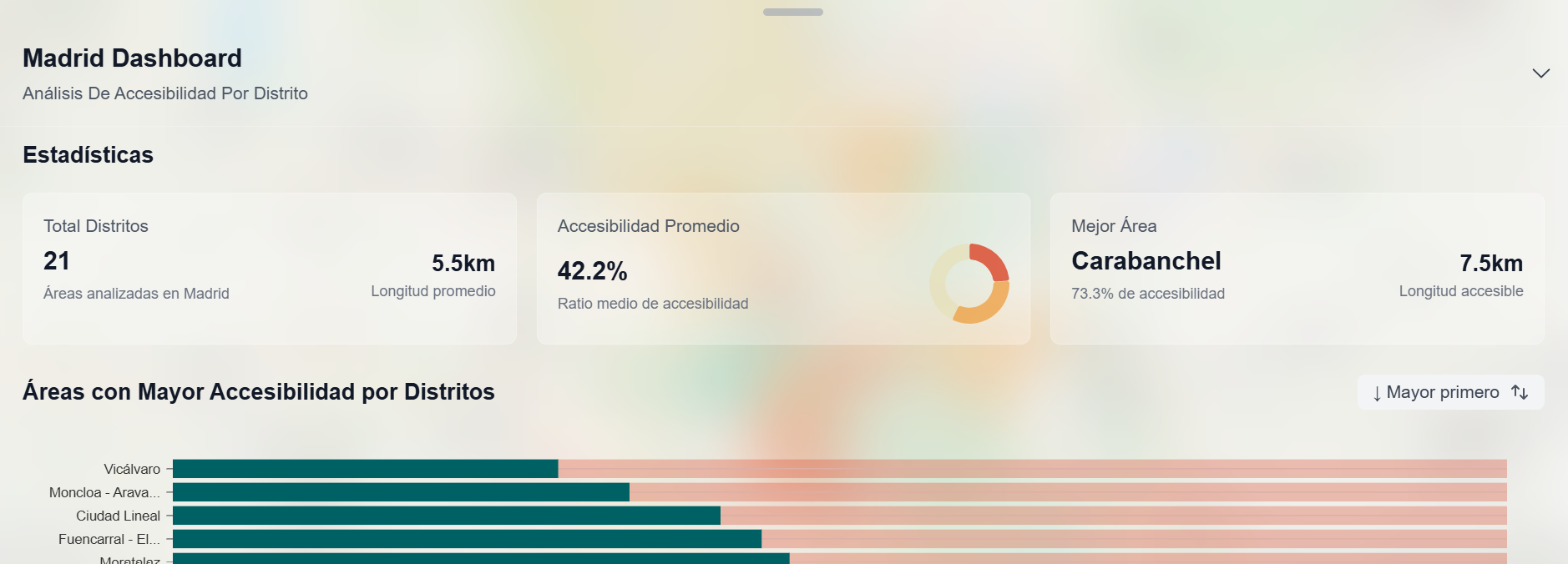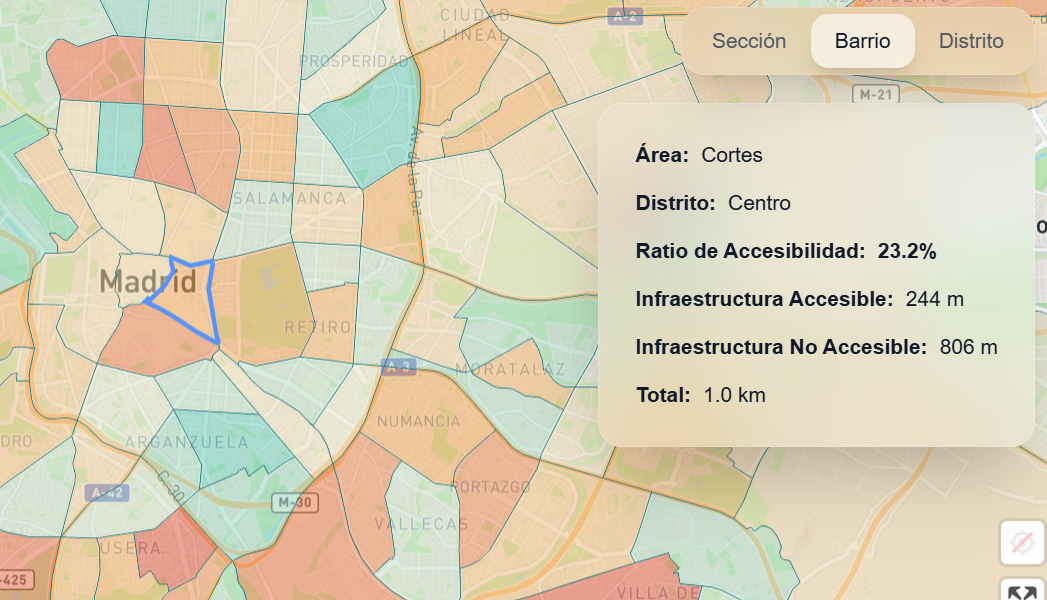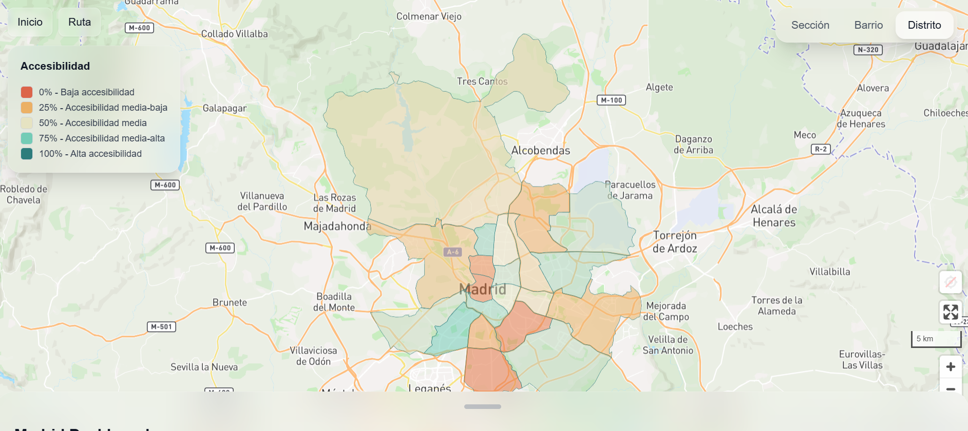 - Panel de control: permite visualizar las áreas con mayor y menor accesibilidad en Madrid y detecta los barrios y distritos más accesibles.