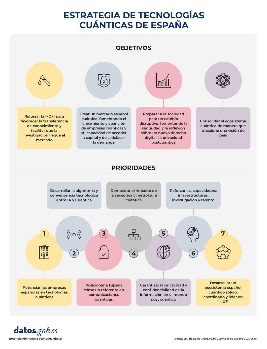 Además, muy recientemente se ha presentado la Estrategia de Tecnologías Cuánticas de España con una inversión de 800 millones de euros. Esta estrategia se estructura en 4 objetivos estratégicos y 7 acciones prioritarias.