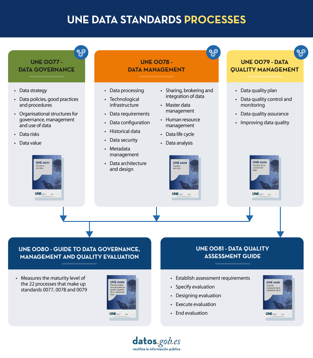 Before starting, it is important to know the different processes that make up each of the UNE data specifications. This image shows what they are.