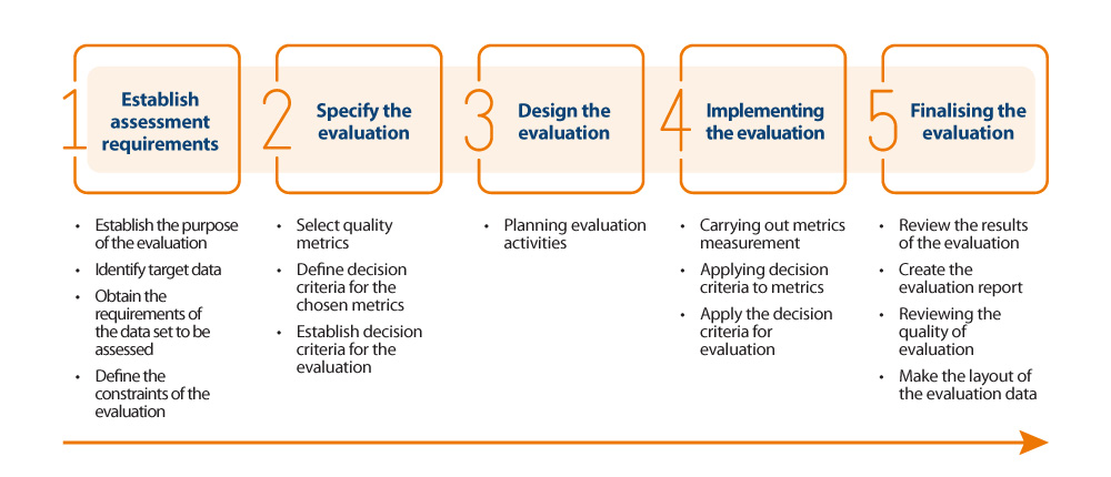 In order to carry out the assessment in an appropriate way, it is decided to make use of the quality assessment process based on ISO 25024, indicated in the UNE 0081 specification (see below).