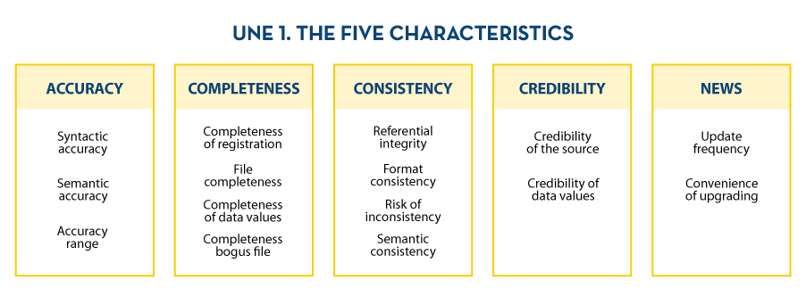 - On the other hand, UNE 0081 defines a data quality model, based on ISO/IEC 25012 and ISO/IEC 25024, which details the quality characteristics that data can have, as well as some applicable metrics. It also defines the process to be followed to assess the quality of a particular dataset, based on ISO/IEC 25040. Finally, the specification details how to interpret the results obtained from the evaluation, showing concrete examples of application.