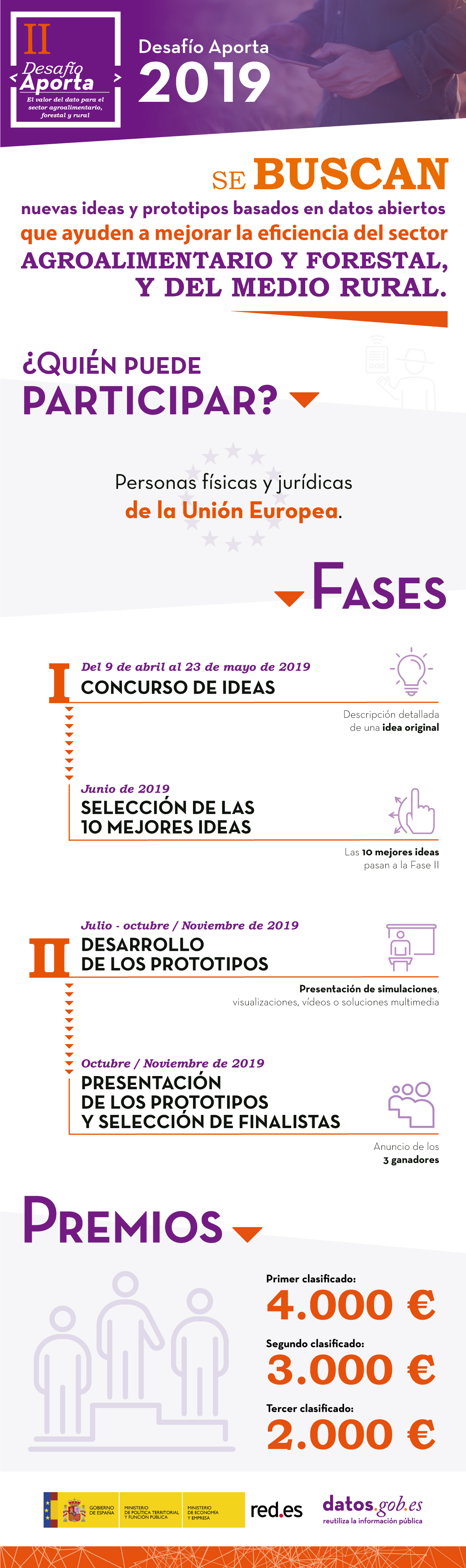 Ya está en marcha una nueva edición del Desafío Aporta. Al igual que en la edición anterior, se buscan nuevas ideas y prototipos basados en datos abiertos, que ayuden a mejorar la eficiencia de un sector concreto. En este caso, se ha elegido el sector agroalimentario y forestal, y del medio rural, un sector fundamental para la creación de riqueza y empleo.